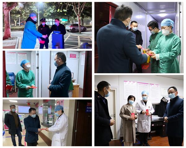 除夕夜,医院领导心系一线职工。当晚9时,党委书记曹正清、副院长谭大林带领部分中层骨干及总值班人员深入各科室,亲切慰问除夕夜坚守在临床一线的医务人员、行政后勤人员及火车站疫情防控值班人员,向他们致以亲切的节日问候与祝福。